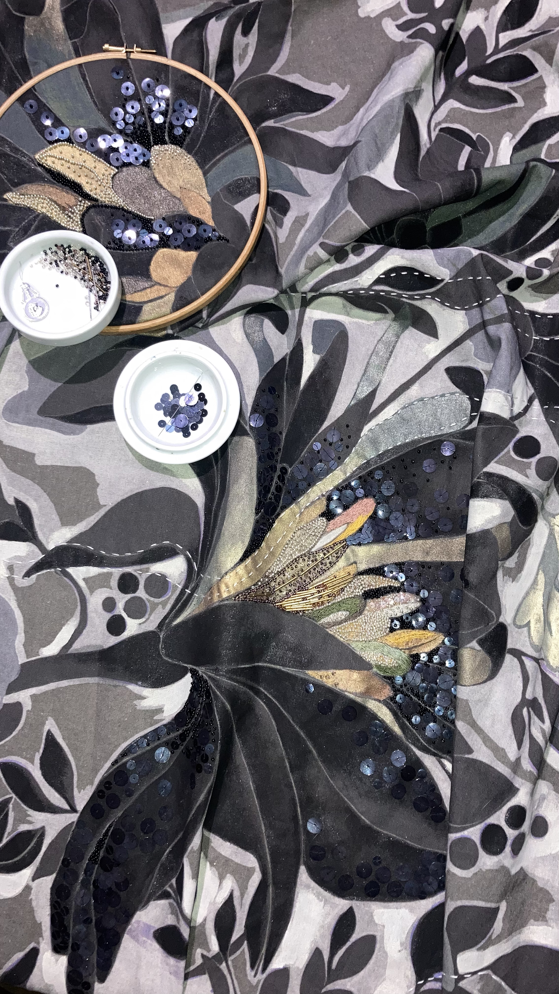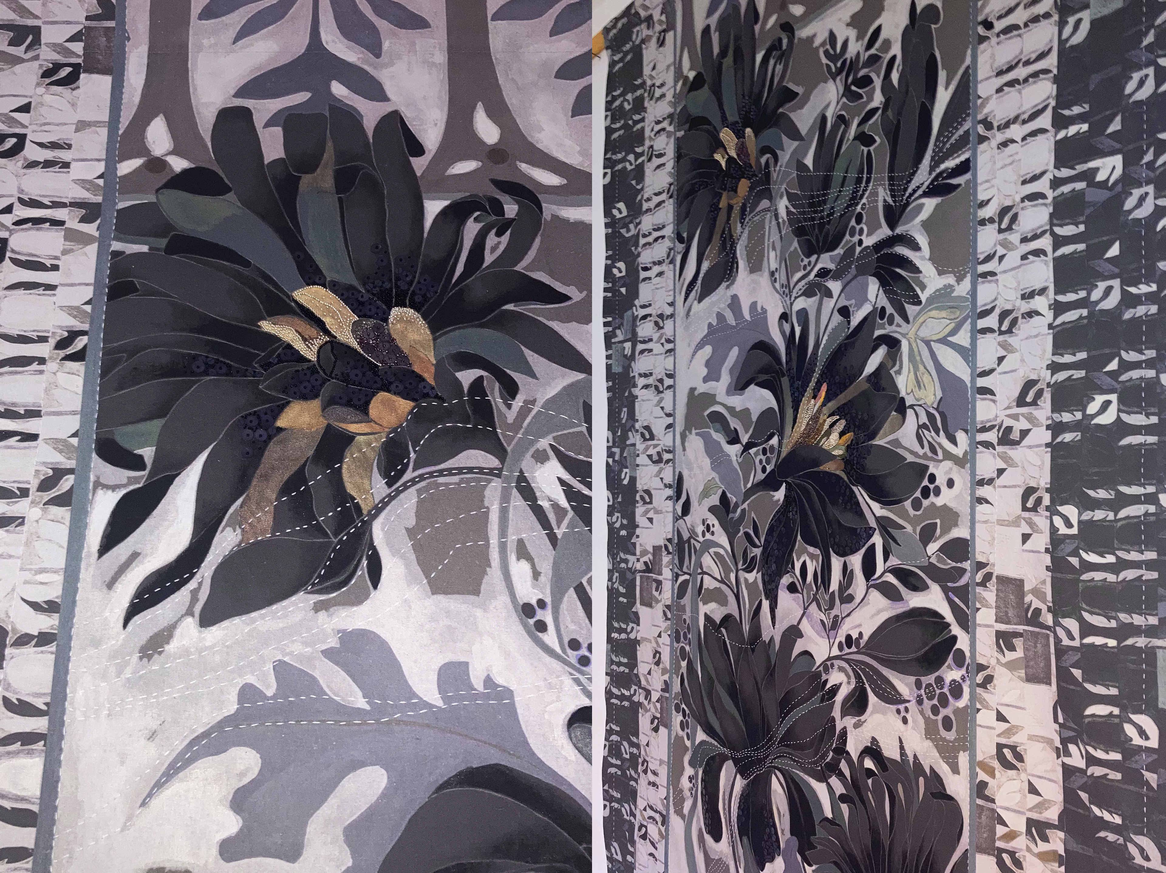 PÉONY NOIR & ÉCRU Pièce unique Numéro 1, impressions sur Lin coton en série limitée à 7 exemplaires par version couleur avec interventions uniques à la main, peinture, broderies avec fil de Sashiko japonais et délicat mélange de sequins et perles métallisées et translucides.